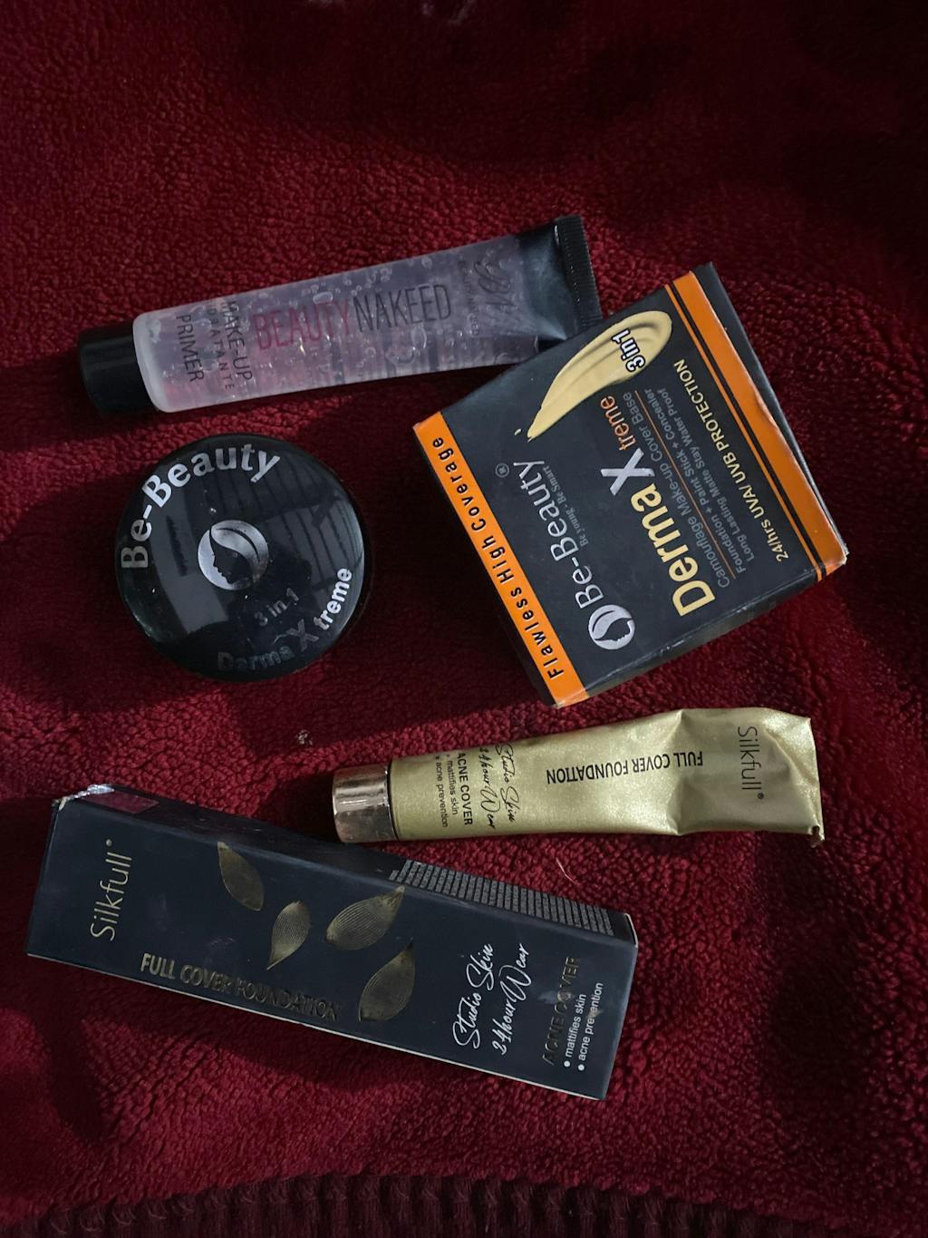 The image shows Be-Beauty Derma Xtreme, a 3-in-1 makeup cover base that functions as a foundation, paint stick, and concealer It offers flawless, high coverage with a long-lasting matte, waterproof finish. It also provides 24-hour UVA/UVB protection. All shades are available.
